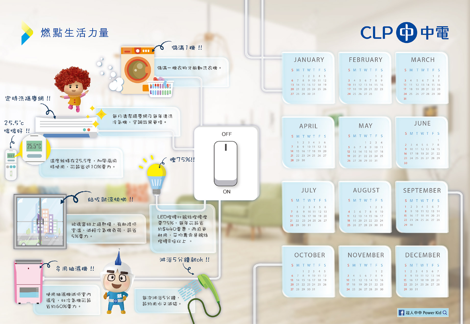 CLP Energy Saving Calendar is a concept project created for CLP, one of Hong Kong’s leading electricity providers, as part of a sustainability-driven design initiative. The project explored how visual communication could inspire everyday energy-saving habits in a simple and engaging way. Our work focused on developing an informative yet accessible calendar that combines practical tips with friendly, easy-to-understand visuals. Designed to resonate with a broad audience, the result encourages mindful energy use and highlights how small daily actions can make a meaningful impact toward a greener future.